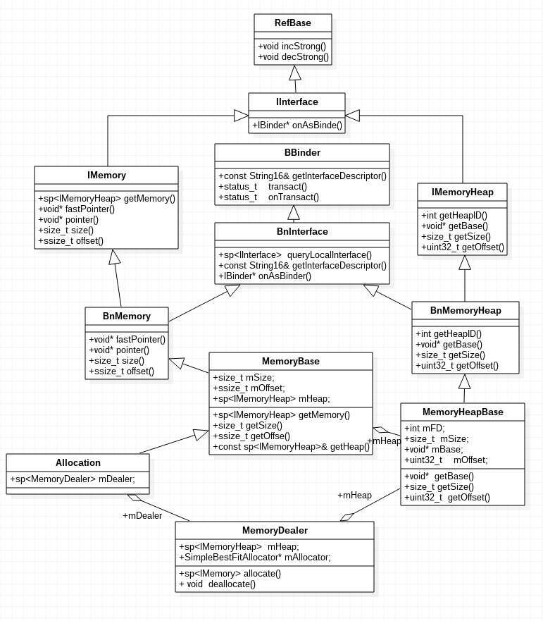 当pointer调用完getMemory(&offset)获得BpMemoryHeap后,马上调用base()方法(BpMemoryHeap父类IMemoryHeap的方法),向MemoryHeapBase通信: