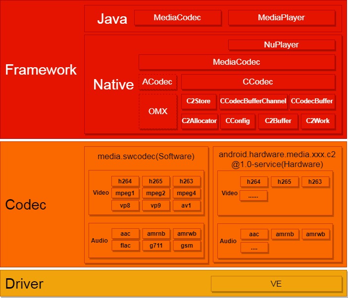 其中Framework层要使用Codec2可通过MediaCodec或者MediaPlayer(使用NuPlayer),Omx在Android12后已弃用,Codec层可分为Android原生的软件编解码和硬件编解码,本文只涉及Android原生代码。